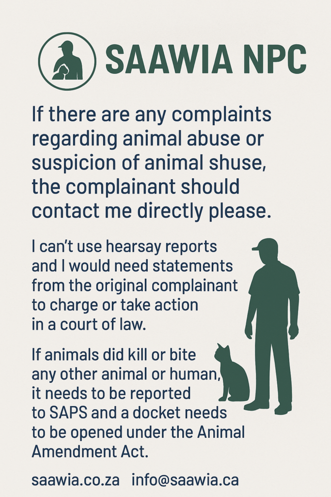 At SAAWIA we have access to many various lawyers around South Africa, whose passion is with the animals and to help us achieve the goals of what SAAWIA is all about.