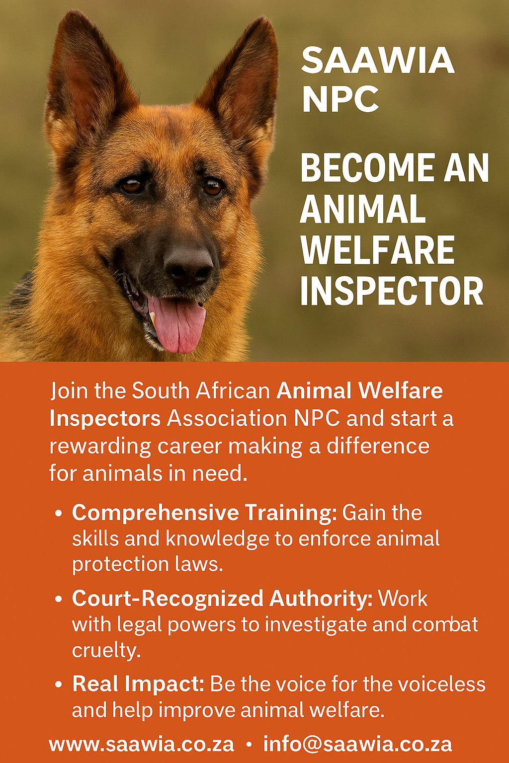 • SAAWIA is recognized by the South African government as a legitimate organization for training animal welfare inspectors.
